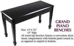 Size: 14 in. X 33in X 19in. high. All wood top benches feature sheet music compartment with bottom panel routed in. No staples